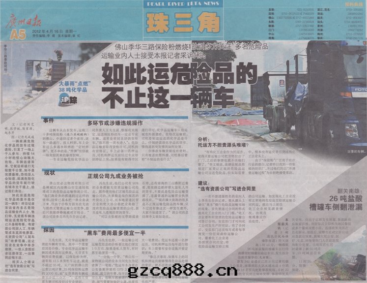 2012年(nián)4月(yuè)16日(rì)《廣州日(rì)報》 廣州日(rì)報和(hé)佛山(shān)電(diàn)視台(tái)小強(qiáng)热(rè)線(xiàn)分(fēn)别在 1、世必达(dá)物(wù)流公(gōng)司作(zuò)为(wèi)禅城(chéng)區(qū)唯一(yī)一(yī)家(jiā)具有(yǒu)危險貨物(wù)運輸資質(zhì)的(de)物(wù)流公(gōng)司,具有(yǒu)嚴格規範的(de)運輸管(guǎn)理(lǐ),可(kě)以(yǐ)确保危險貨物(wù)的(de)運輸过(guò)程的(de)安(ān)全(quán)。公(gōng)司对(duì)危險貨物(wù)的(de)運輸嚴格按交通(tòng)管(guǎn)理(lǐ)部(bù)門(mén)規範進(jìn)行操作(zuò),所(suǒ)有(yǒu)車輛均安(ān)裝(zhuāng)GPS定(dìng)位(wèi)監管(guǎn)系(xì)統,由(yóu)專人(rén)管(guǎn)理(lǐ)和(hé)監控,随时(shí)掌握公(gōng)司車輛動(dòng)态。每月(yuè)都有(yǒu)召開(kāi)安(ān)全(quán)会(huì)议,強(qiáng)化(huà)員工安(ān)全(quán)意(yì)識,定(dìng)期(qī)安(ān)排消防演練工作(zuò)與(yǔ)日(rì)常處(chù)理(lǐ)事故培訓,增強(qiáng)应急補救能力,嚴格按照要(yào)求定(dìng)崗、定(dìng)时(shí)、定(dìng)人(rén)、定(dìng)責。 2、目前(qián)運輸市(shì)场(chǎng)比較混亂,尤其是(shì)危險品運輸市(shì)场(chǎng)被(bèi)“野雞車”搶占了(le)差不(bù)多(duō)80%以(yǐ)上(shàng)的(de)份額,而(ér)目前(qián)危運車輛運輸成本(běn)比普貨車輛的(de)運輸成本(běn)一(yī)般都要(yào)高(gāo)30%左(zuǒ)右(yòu),加上(shàng)危險品運輸市(shì)场(chǎng)監管(guǎn)的(de)力度不(bù)強(qiáng),大(dà)部(bù)分(fēn)企業为(wèi)了(le)节(jié)省運輸成本(běn),也甘願冒險使用(yòng)便宜的(de)普通(tòng)運輸車輛来(lái)運輸危險品。 3、希望交通(tòng)管(guǎn)理(lǐ)部(bù)門(mén)能夠從源头(tóu)抓起(qǐ),建立托運方(fāng)擔責制度,並(bìng)要(yào)求化(huà)工企業必須與(yǔ)有(yǒu)資質(zhì)的(de)危險品運輸公(gōng)司签(qiān)訂運輸合同(tóng),才可(kě)向(xiàng)化(huà)工企業發(fà)放(fàng)生(shēng)産經(jīng)營許可(kě)證,從源头(tóu)堵漏洞,将風(fēng)險和(hé)事故降到(dào)最(zuì)低(dī),讓危險品運輸市(shì)场(chǎng)往良性(xìng)方(fāng)向(xiàng)發(fà)展。 |