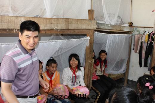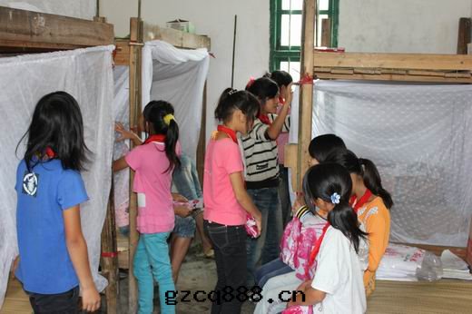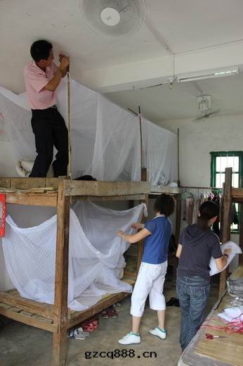 與(yǔ)此同(tóng)时(shí),我(wǒ)们(men)的(de)工作(zuò)人(rén)員也分(fēn)組忙開(kāi)了(le),负責挂蚊帐的(de)同(tóng)事分(fēn)成6个小組,每个小組二(èr)到(dào)三(sān)人(rén),分(fēn)别到(dào)6間(jiān)學(xué)生(shēng)宿舍給(gěi)住宿生(shēng)挂蚊帐,同(tóng)事们(men)有(yǒu)的(de)爬上(shàng)架子床(chuáng)挂蚊帐,有(yǒu)的(de)在下(xià)面(miàn)用(yòng)绳(shéng)子加固竹(zhú)杆,公(gōng)司的(de)幾(jǐ)位(wèi)老(lǎo)總(zǒng)在座談結束(shù)后也投入(rù)了(le)戰斗(dǒu)。保安(ān)隊长(cháng)郝斌充分(fēn)發(fà)揮保安(ān)的(de)硬(yìng)漢作(zuò)風(fēng),带(dài)头(tóu)爬上(shàng)架子床(chuáng)搭架挂蚊帐,他(tā)负責的(de)宿舍蚊帐首先(xiān)挂好,挂好后他(tā)沒(méi)有(yǒu)休息,又到(dào)隔壁(bì)帮忙。10时(shí)40分(fēn),各(gè)宿舍的(de)蚊帐基本(běn)挂好了(le)。